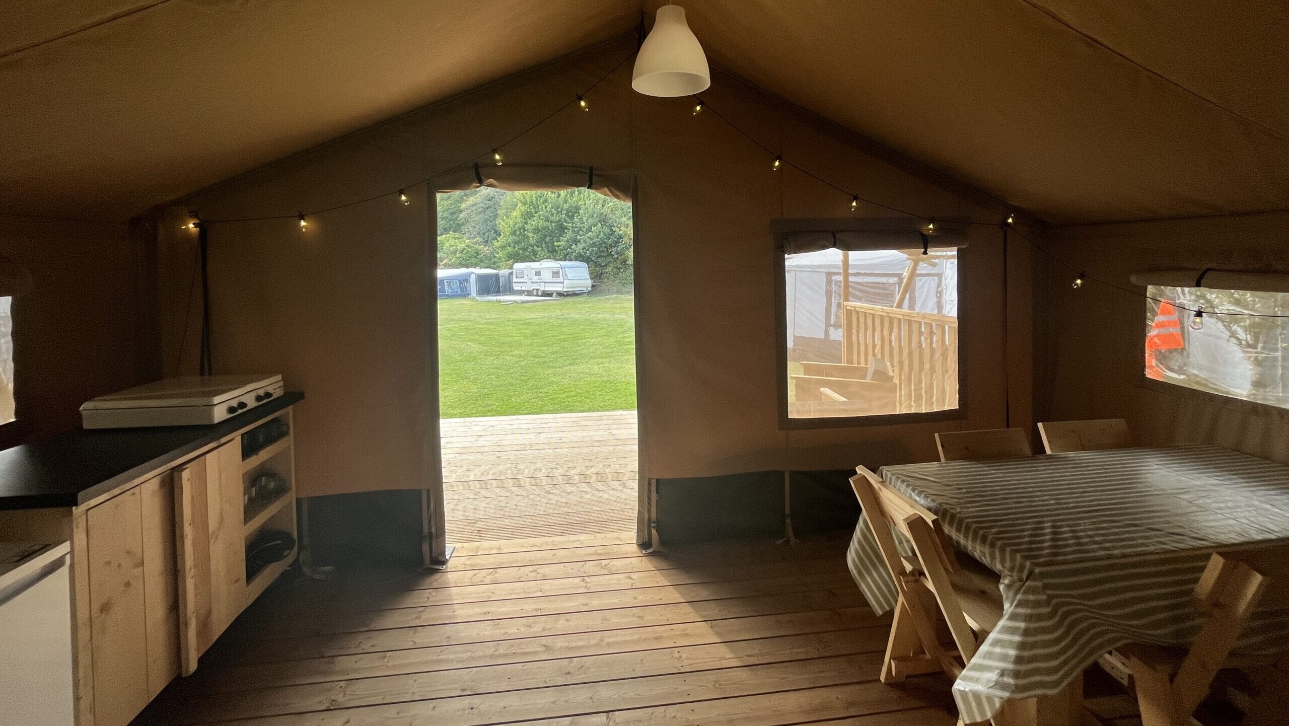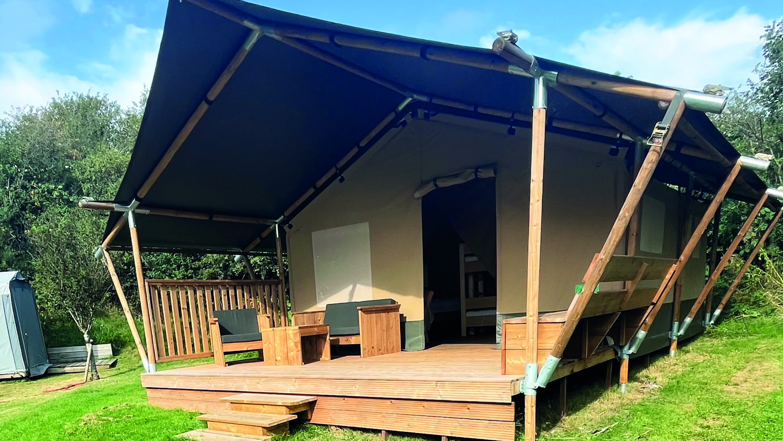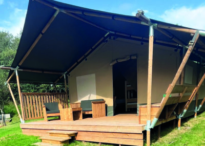 Alle telte har en privat terrasse, hvor I kan nyde morgenkaffen eller de lange sommeraftener.