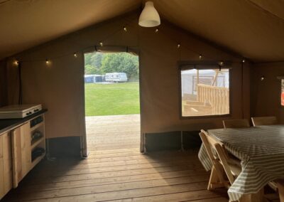 Derudover findes der et hyggeligt opholdsrum med plads til samvær og afslapning. Teltene har et lille køkken med køleskab, gasblus, el-kande og kaffemaskine. Til madlavning kan man også benytte vores fælleskøkkener på pladsen.